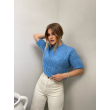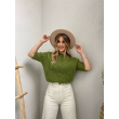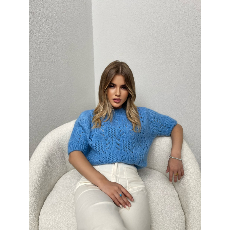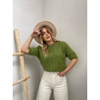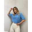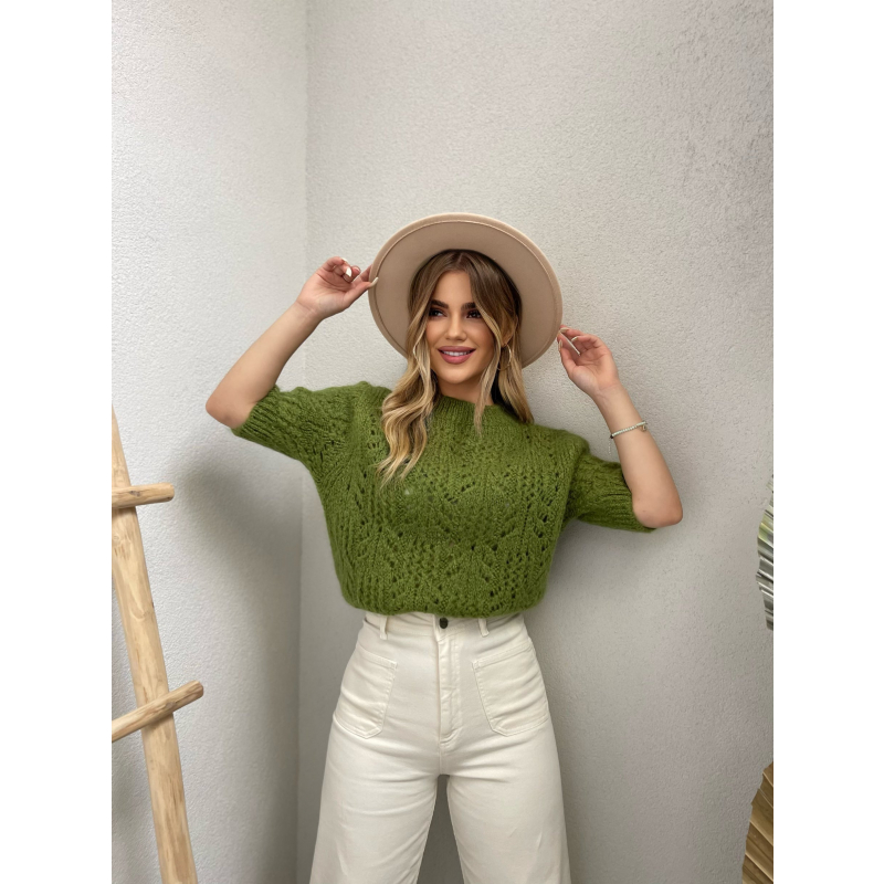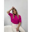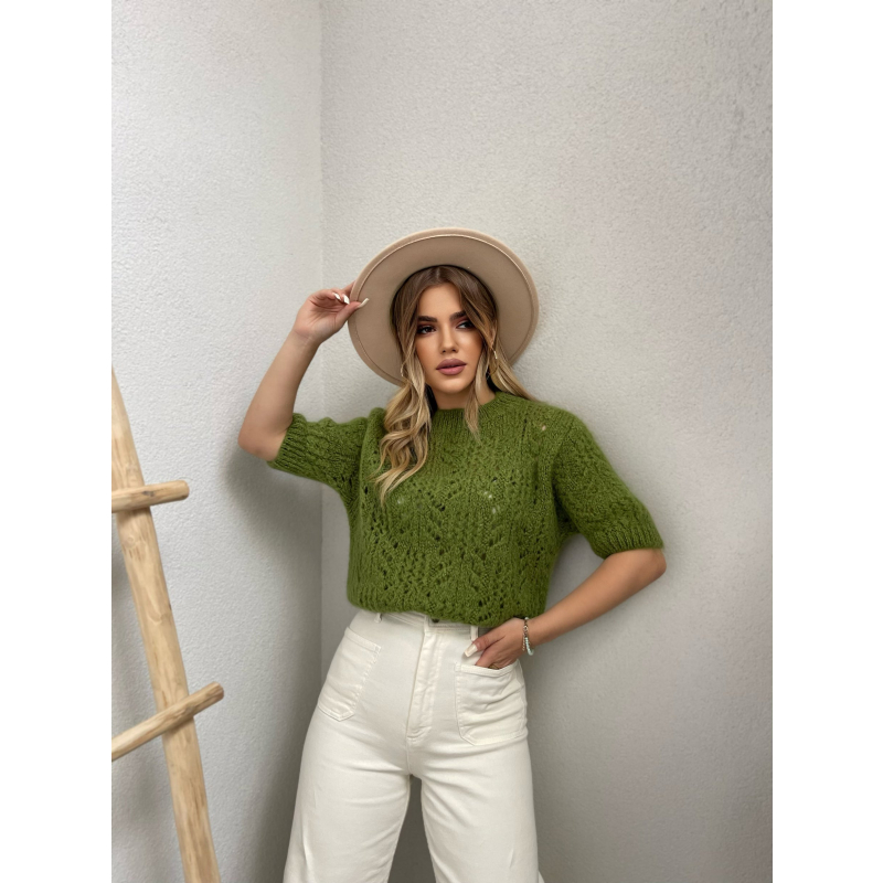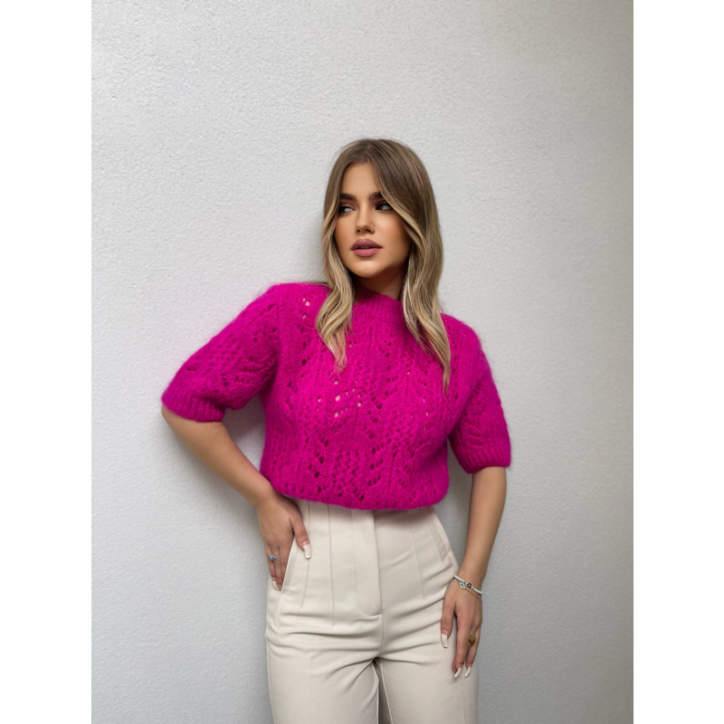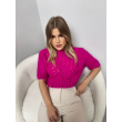 Pulover punim me grep me menge te shkurtra. Me pjes llastiku ne fund te mengeve dhe ne fund te pulovres. Me jake rrethore. Modeli vjen ne tri ngjyra:pink, jeshile dhe blu.
