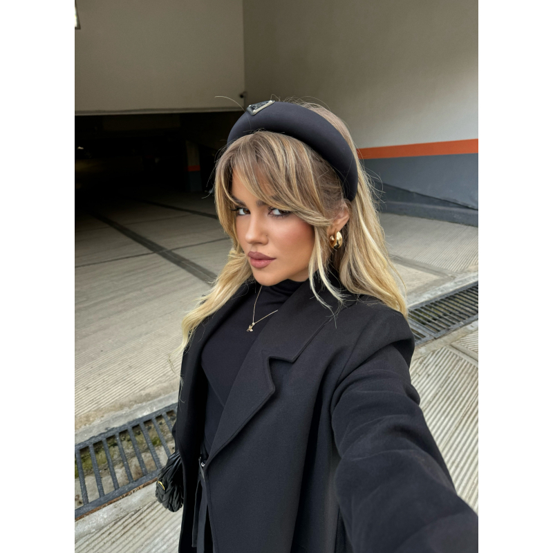 Rreth koke stilor ne ngjyre te zeze, i zbukuruar me detaje metalike “Prada” per nje pamje elegante dhe luksoze.