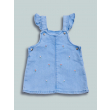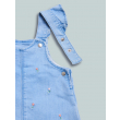 Salopette gonna in morbido denim elasticizzato, bretelle regolabili e apertura sui fianchi con bottoni a pressione. Fiorellini colorati ricamati. La rouches dona un tocco di vivacità. Un capo sfizioso, ideale da abbinare alle tshirt della collezione.