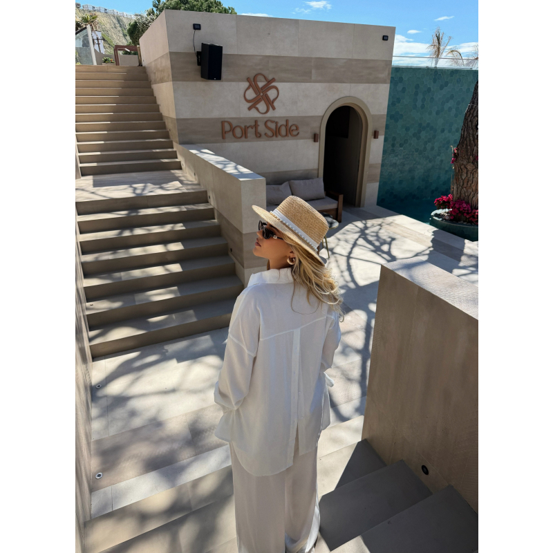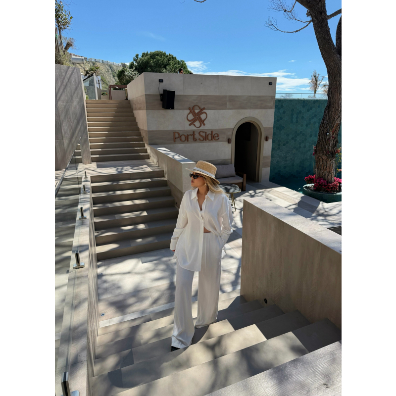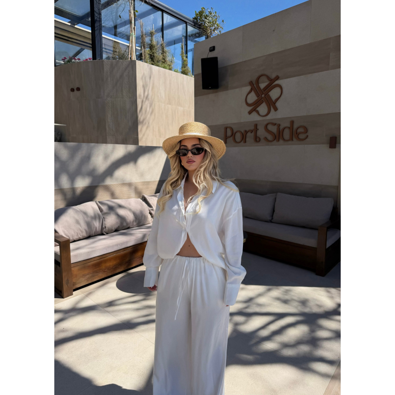 Set i bardhe minimalist me kemishe dhe pantallona te gjera. Jep nje pamje te paster, elegante dhe shume moderne per cdo rast.