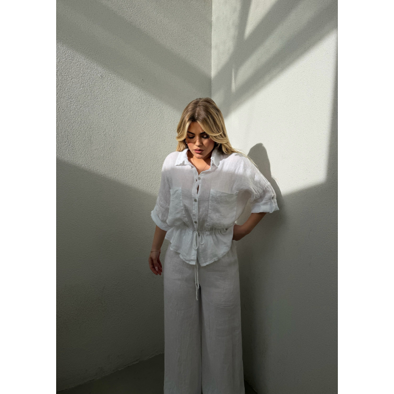 Set lino kemishe dhe pantallona te gjera. Kemisha mund te ndushtohet sipas deshires me lidhese ne bel. Me xhepa kuti perpara. Krahet mund te shkurtohen sipas deshires.
