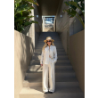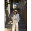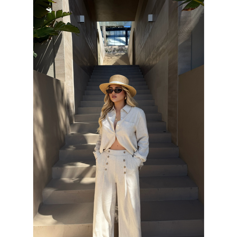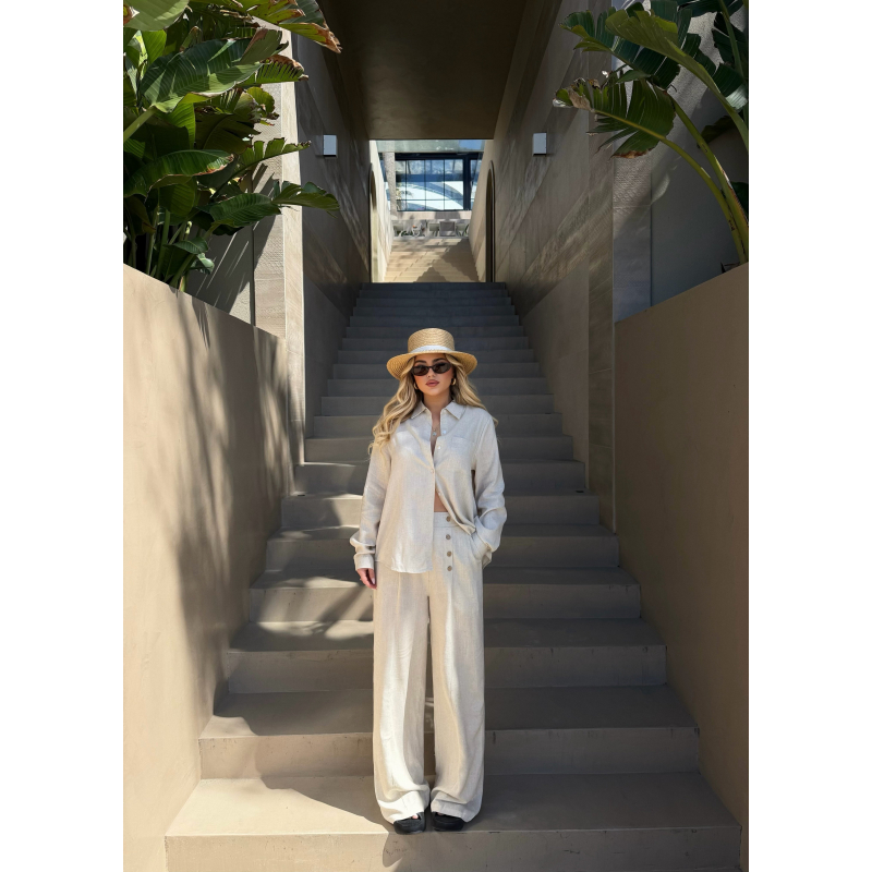 Set lino elegant ne ngjyre bezhe me kopsa ne ngjyren kafe stil i paster per cdo dite.