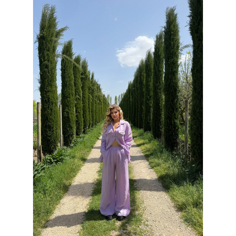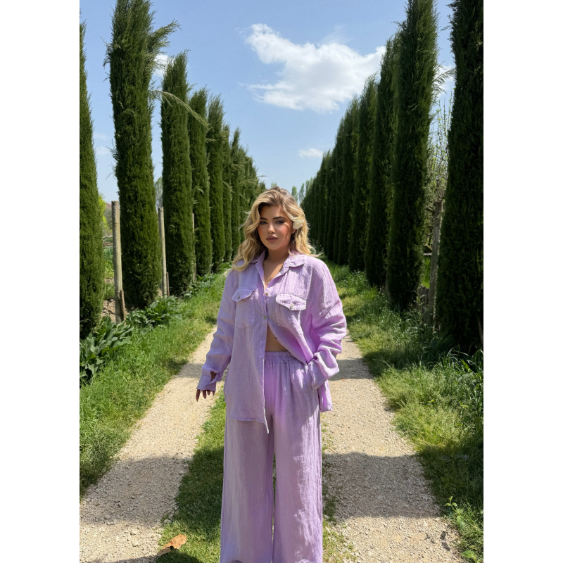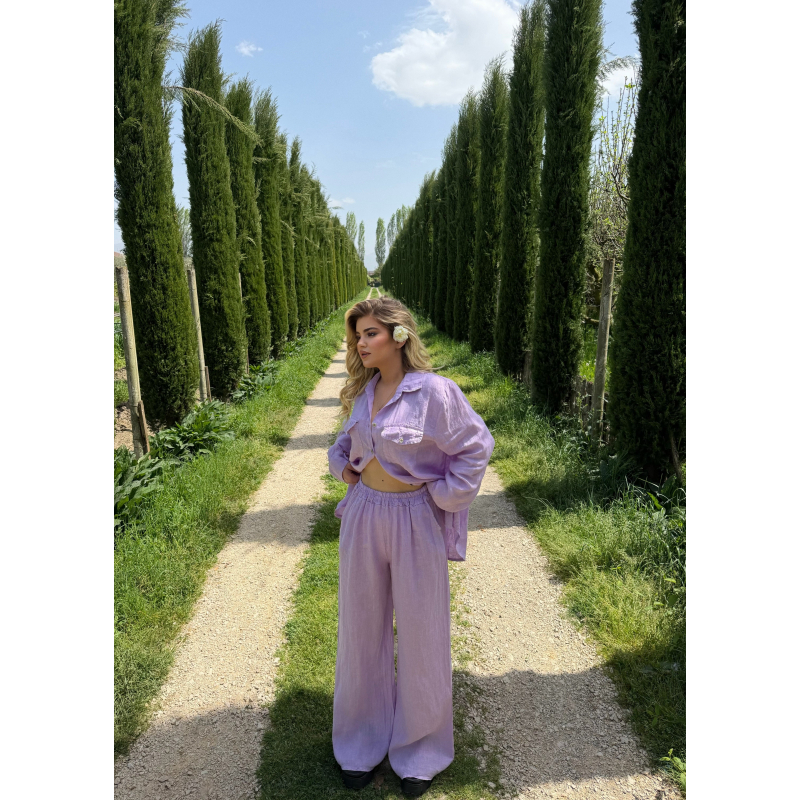 Set lino me dy pjese. Vjen me kemishe me xhepa para dhe pantallona te gjata. Ka material te plote dhe cilesi fantastike.