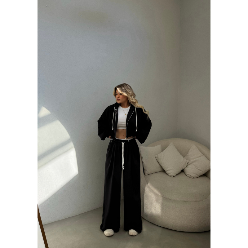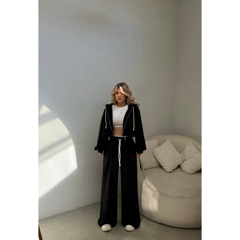 Set sportiv me dy pjese. Pantallona te gjera me llastik te beli . Xhakete e shkurter me llastik te menget.