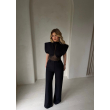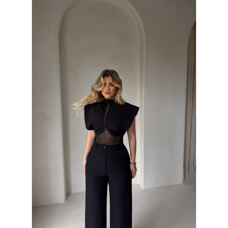 Set modern me bluzen me detaj tyli dhe kopsa nga pase dhe  pantallona klasike. Jep një look elegant dhe tërheqës për mbrëmje.