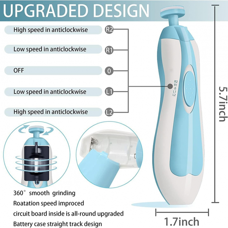 Prerësja e thonjve është dhurata perfekte për çdo foshnjë dhe fëmijë të vogël, duke ofruar një mënyrë të sigurt dhe të lehtë për të prerë thonjtë e foshnjës. Ky mjet i avancuar është i pajisur me 6 kokë fërkimi të ndryshme, të cilat janë të përshtatshme për foshnjat, fëmijët dhe madje edhe të rriturit. Pavarësisht nëse jeni në shtëpi apo në udhëtim, ky trimer i vogël është gjithmonë i përshtatshëm dhe i sigurt për t’u përdorur.