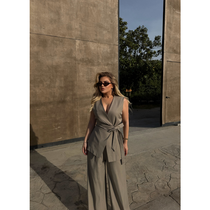 Set me dy pjese ne ngjyre ulliri.Set elegant me pantallona te gjata dhe jelek ne ngjyre ulliri. Kombinim modern dhe shume praktik, i pershtatshem per nje pamje te rregullt dhe me stil ne cdo rast.