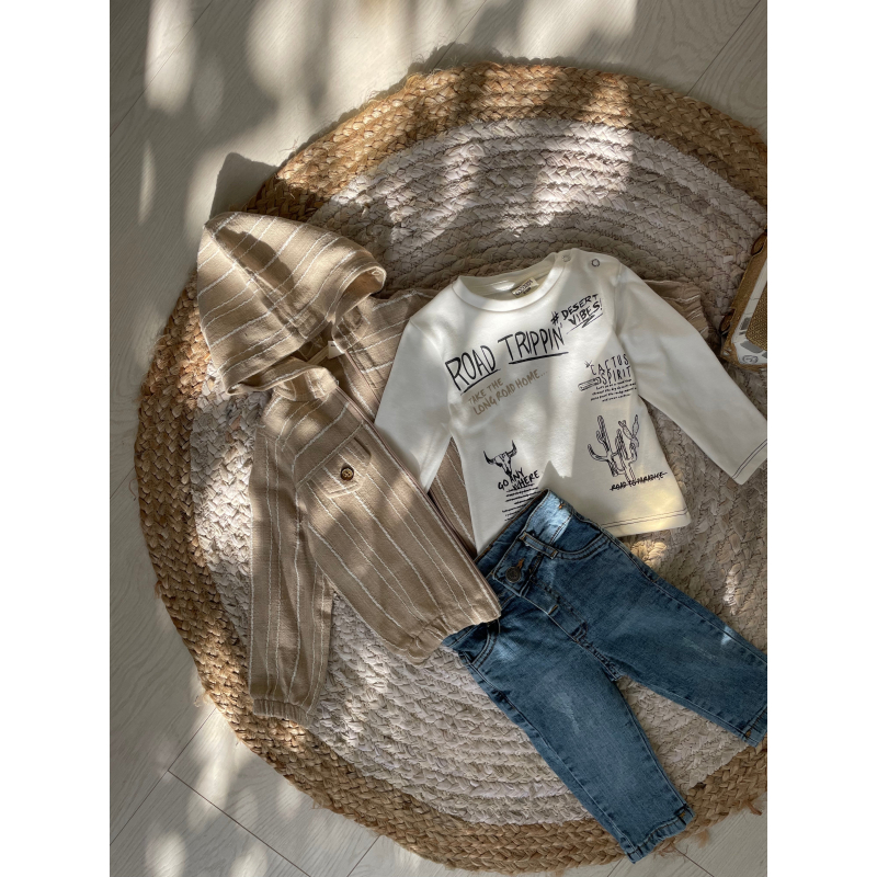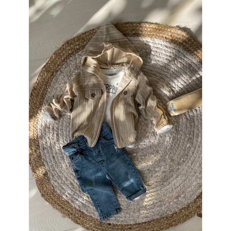 Kostum me tre pjese. Vjen me xhakete me zinxhir dhe bluze pambuku ne pjesen e poshtme. Ka material te plote dhe cilesi fantastike.