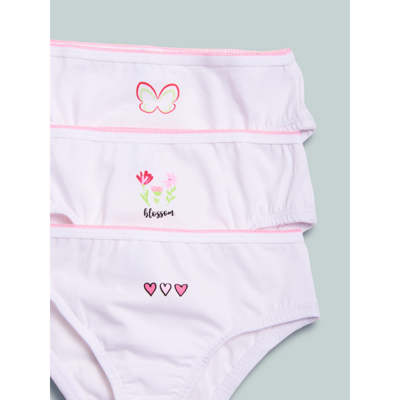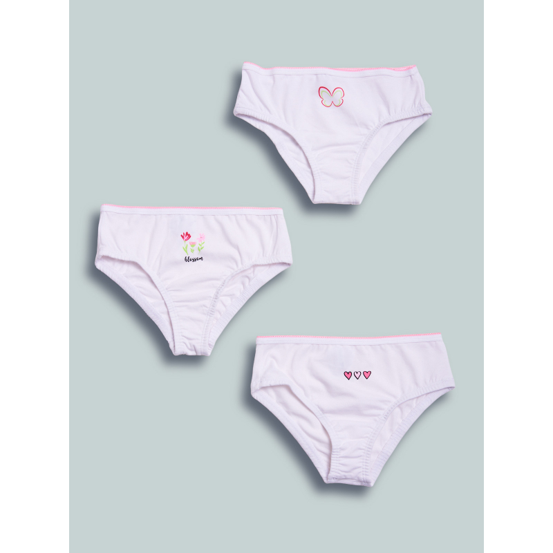 Set composto da tre slip in jersey di cotone elasticizzato morbido e confortevole. Delicati fiori cuori e farfalla a stampa sul davanti. Un capo intimo essenziale, adatto da abbinare alle canotte della collezione.