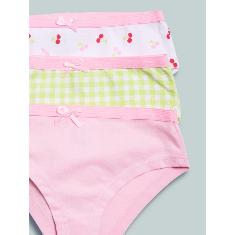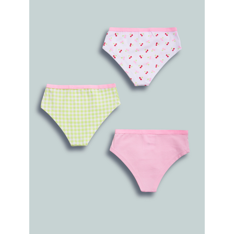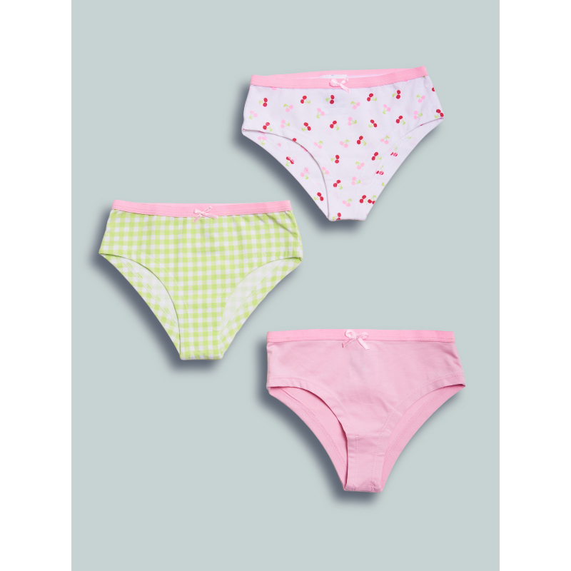 Set composto da tre slip in jersey di cotone elasticizzato fantasia ciliegine, scozzese e unito morbido e confortevole. Un capo intimo essenziale, adatto da abbinare alle canotte della collezione.