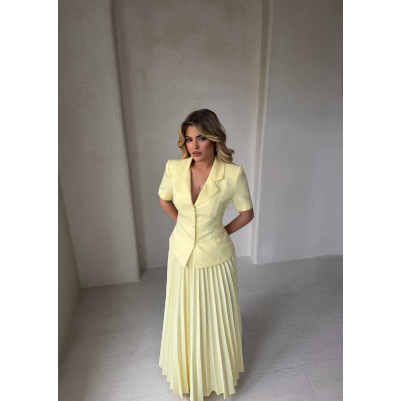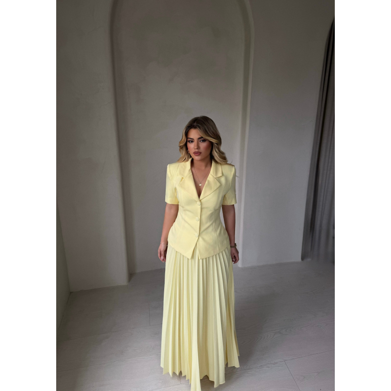 Set me dy pjese ne ngjyre te bardhe dhe te verdhe.Set elegant me xhakete me kopsa perpara dhe fund te gjate me pala. Vjen ne dy variante ngjyrash, te bardhe dhe te verdhe, duke ofruar nje pamje te fresket, te thjeshte dhe shume stil.