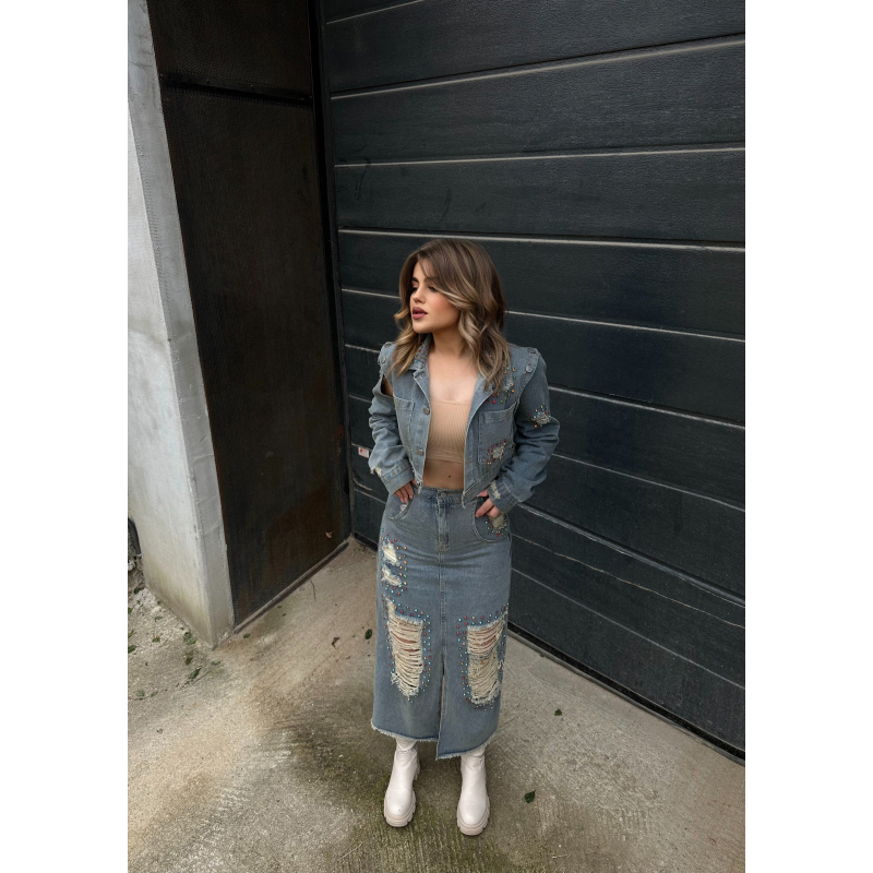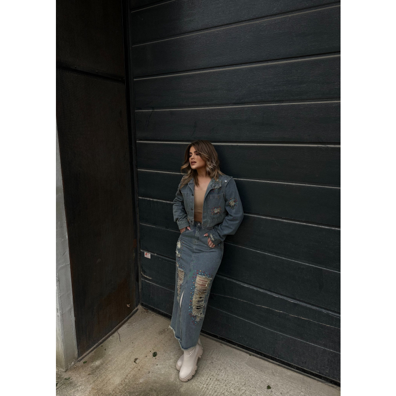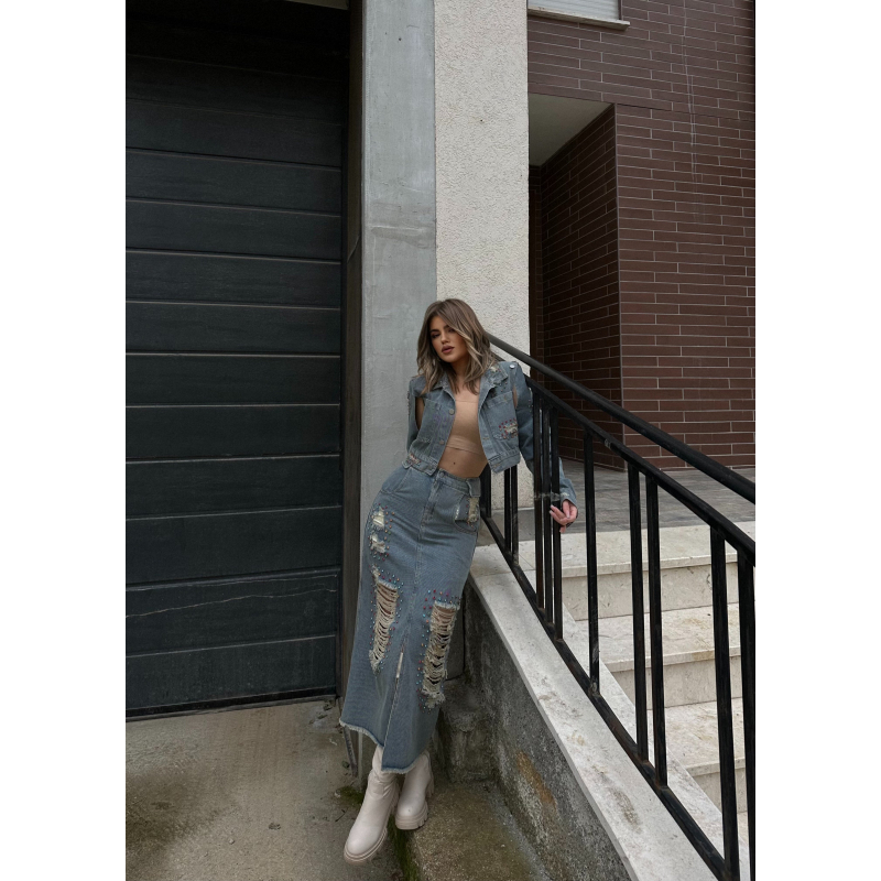 Set xhakete dhe fund xhins me gure te vegjel me ngjyra dhe te grisur perpara. Ka material te plote dhe cilesi fantastike. Xhaketa vjen me te care tek krahet dhe super stil.