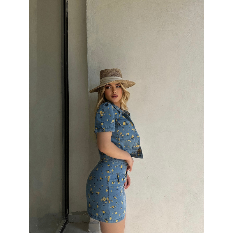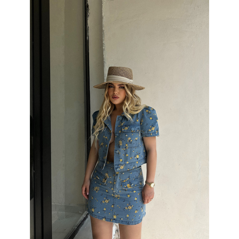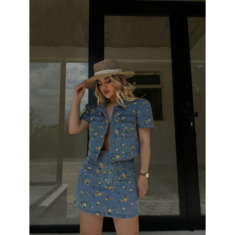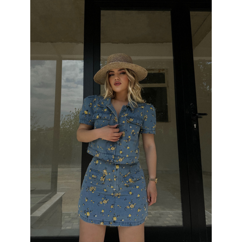 Set xhins me lule.Seti vjen me xhakete me menge te shkurter.Mbyllja behet me ane te kopsave dhe ka detajin e kopsave ne pjesen para.Fundi vjen i shkurter dhe me xhepa.