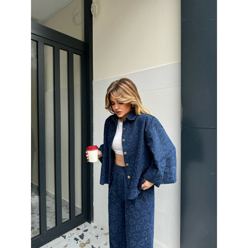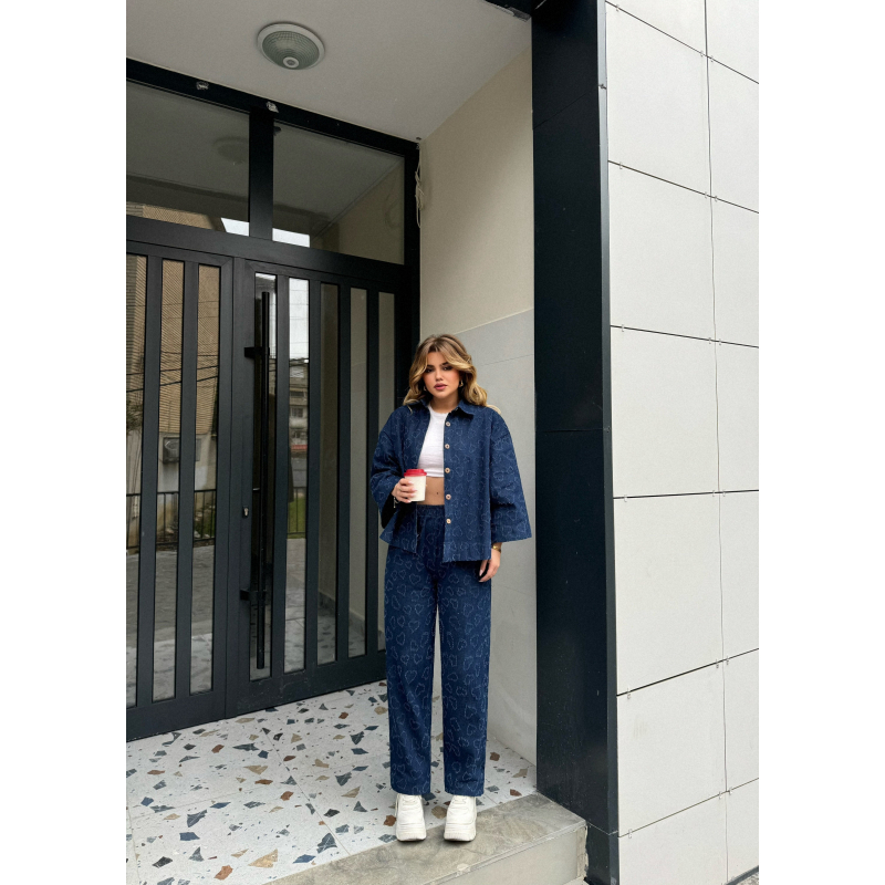 Set xhins me zemra. Xhakete mbyllje me kopsa me menge te shkurtra. Pantallona me bel te gjate dhe te gjera ne fund ,llastik ne bel. Material i plote shume komod.