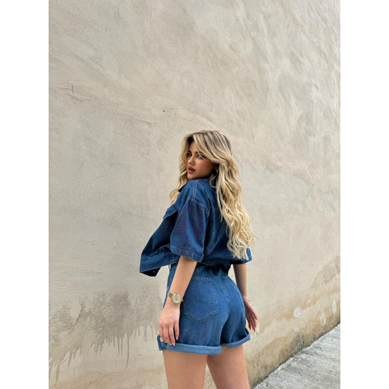 Set xhins me xhakete dhe pantallona te shkurtra. Xhaketa eshte me menge te shkurtra dhe mbyllet me pulla.