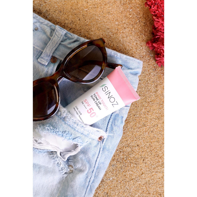 Pamje menjëherë më e gjallë dhe më e ndritshme e lëkurës me bazë rozë, mbrojtje të lartë nga dielli. 50mlKrem dielli për fytyrën Sinoz SPF50+