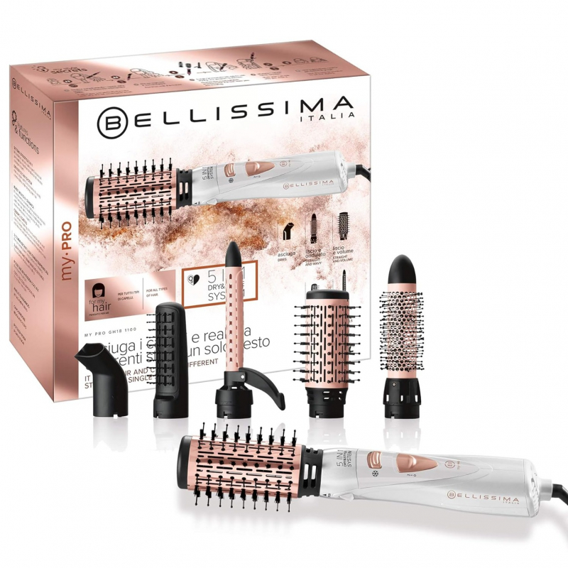 Flokë të butë dhe të drejtë me volum, flokë me valë dhe maja të stilizuara apo kaçurrela të ngushta? Lëreni kreativitetin të lirë dhe krijoni çdo pamje me Bellissima GH18 1100 Dry & Style System 5 in 1, furça me ajër të nxehtë me 5 aksesorë, ideale për çdo stil që dëshironi.