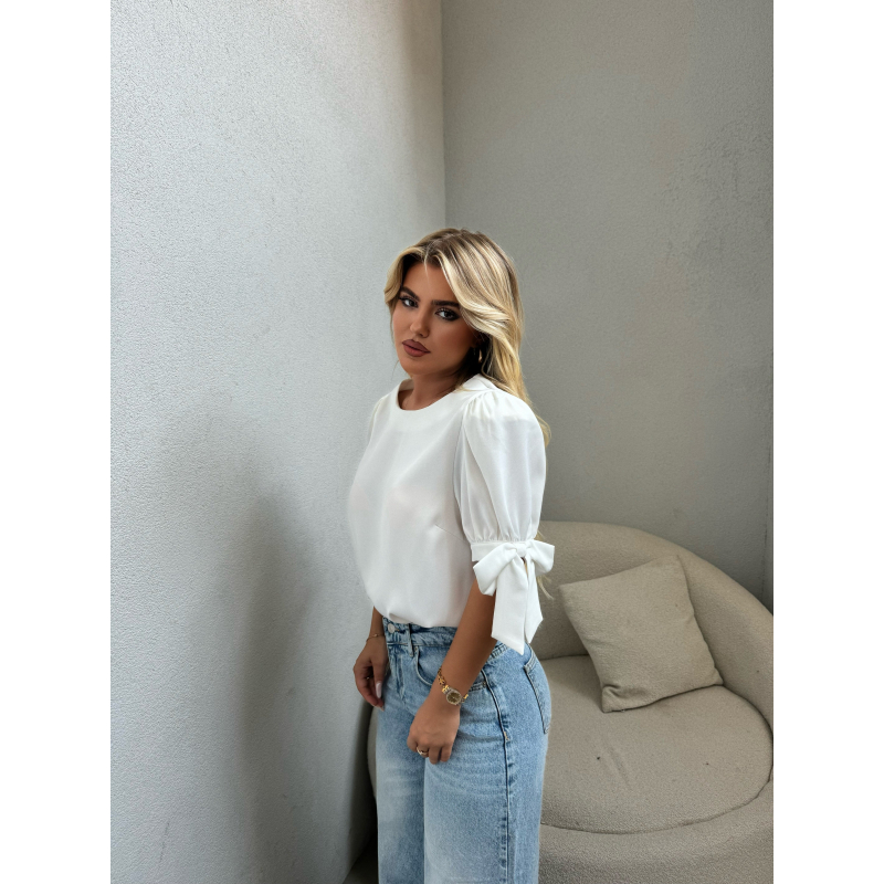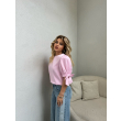 T-shirt me menge te shkurter. Eshte e thjeshte dhe lehtesisht e kombinueshme. Ka fjongo tek menget dhe eshte ne ngjyren roze dhe te bardhe. Material i plote dhe cilesi fantastike.