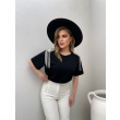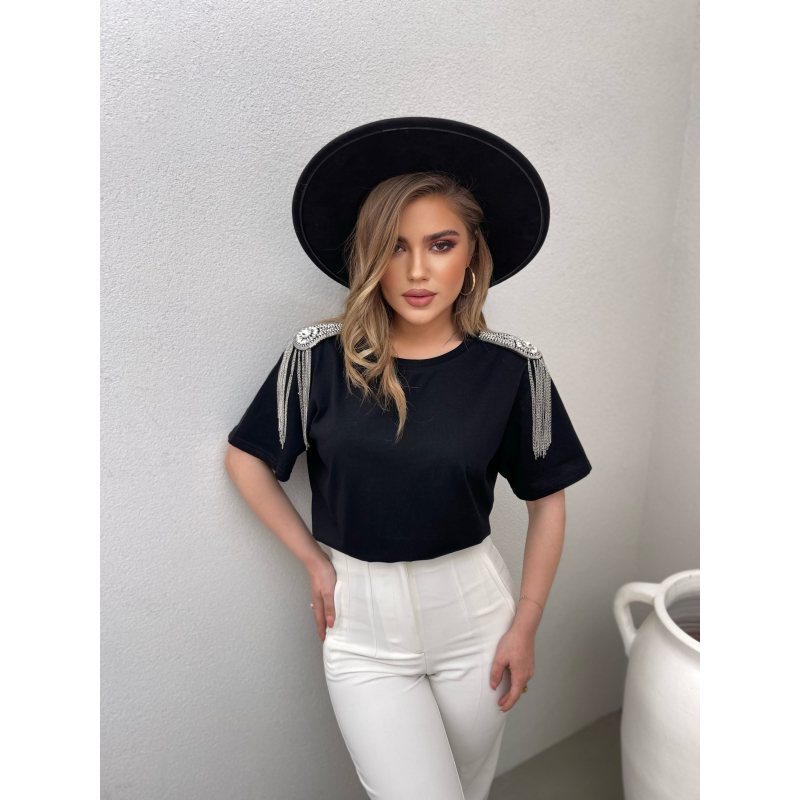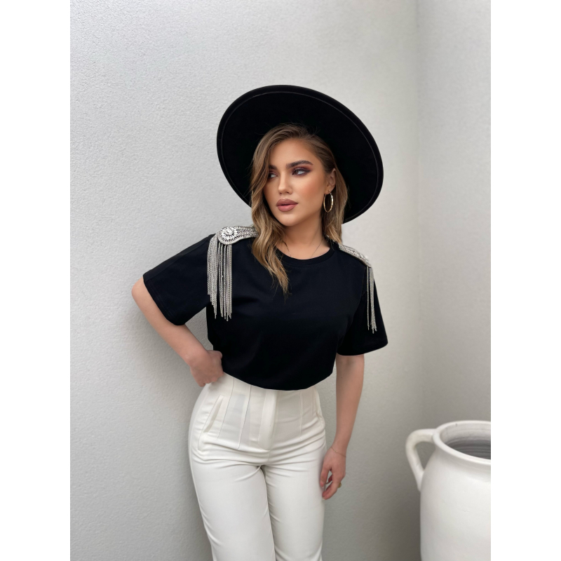 T-shirt me menge te shkurtra me gure ne pjesen e supeve. T-shirti ka gjatesi normale dhe e shte e kombinueshme dhe komode. Modeli vjen ne dy ngjyra: e bardhe, e zeze.
