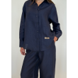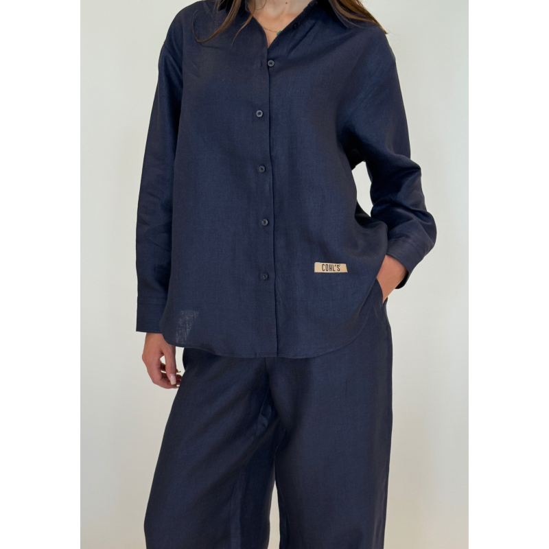 The button-up shirt features a relaxed fit with clean lines, a soft collar, and subtle COHL'S branding, while the wide-leg trousers provide all-day comfort with an easy drape and practical pockets. The deep navy hue adds a refined touch, making this set ideal for lounging, travel, or dressing up with ease.