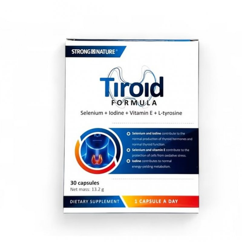 Tiroid Formula është një suplement natyral i formuluar për mbështetjen e funksionit normal të tiroides. Përmban përbërës bimore dhe vitamina që ndihmojnë në balancimin e hormoneve tiroide, përmirësimin e metabolizmit dhe rritjen e energjisë. I përshtatshëm për personat me çrregullime të lehta të tiroides ose për ata që duan të mbajnë në formë funksionin tiroide. Përdorimi: Merrni 1 kapsulë në ditë me një gotë ujë, gjatë ose pas ushqimit, ose sipas udhëzimit të mjekut.