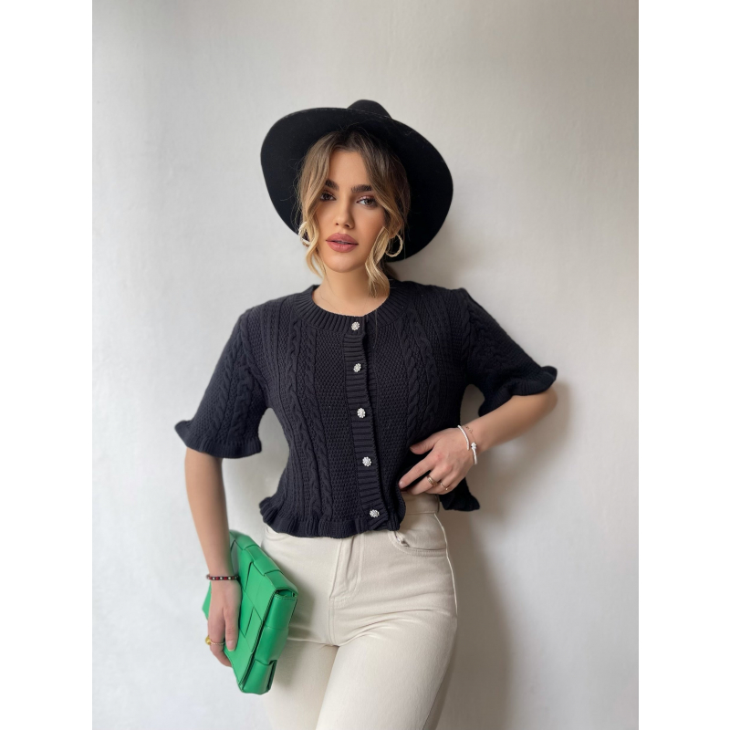 Triko me menge te shkurtra. Detaj jane kopsat me gure. Pjesa e mengeve dhe ne fund te trikos vijne me hark te lakuar. Prerje fantastike. Material shume i mire, me thurje.