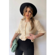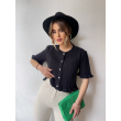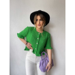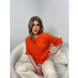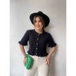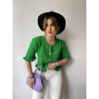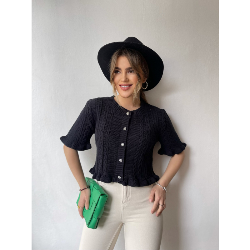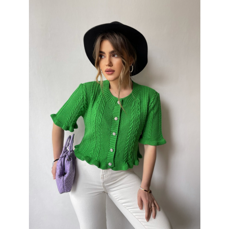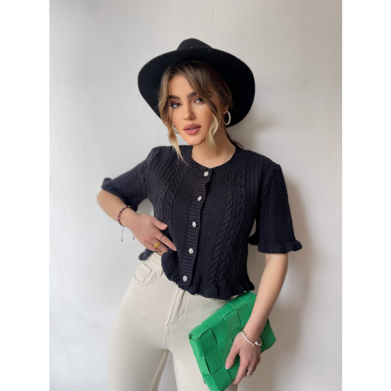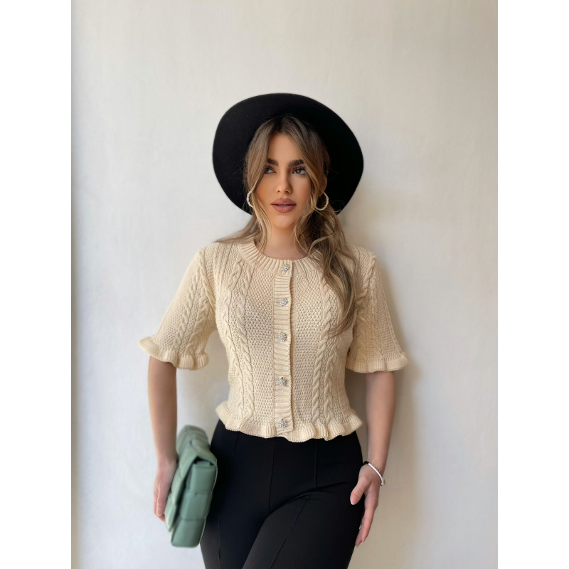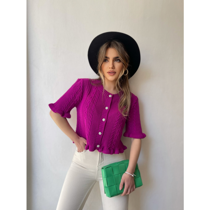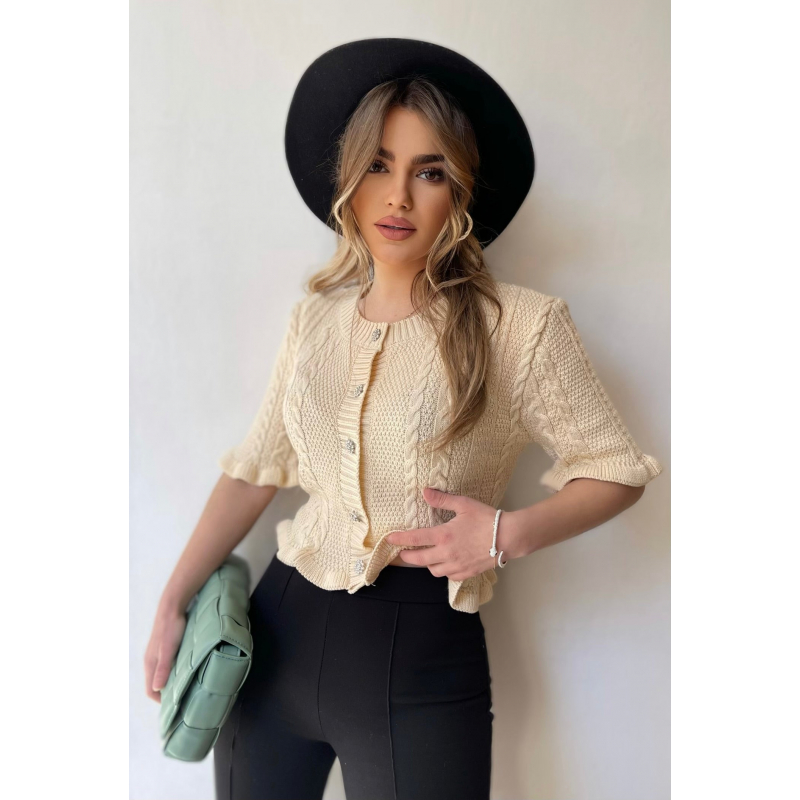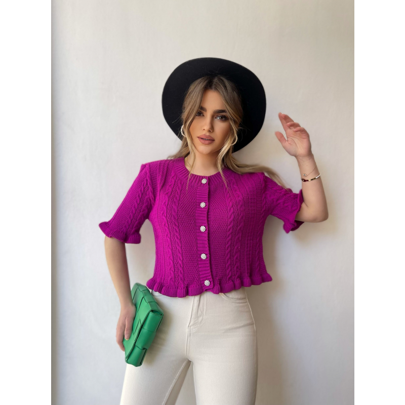 Triko me menge te shkurtra. Detaj jane kopsat me gure. Pjesa e mengeve dhe ne fund te trikos vijne me hark te lakuar. Prerje fantastike. Material shume i mire, me thurje.