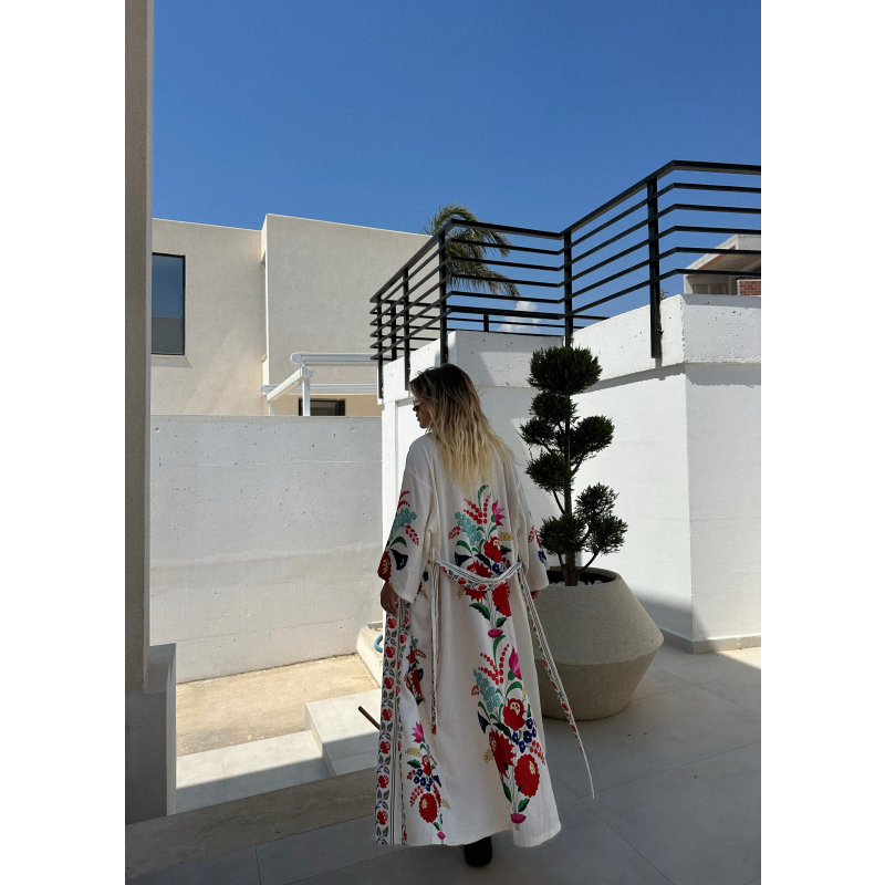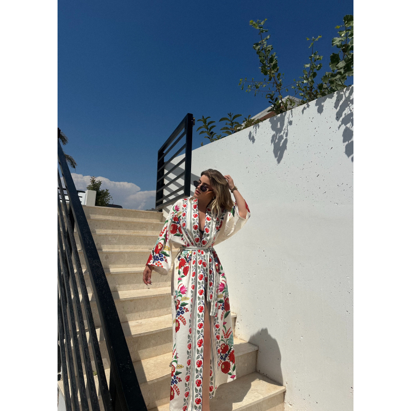 Kimono e shkurter me lule.Vjen me rrip ne bel.Ka material te plote, kombinohet lehtesisht me cdo veshje tjeter. Super stil dhe teper klas.