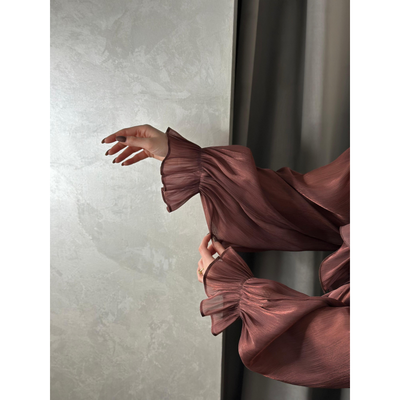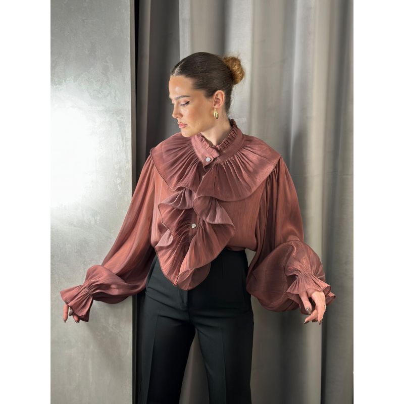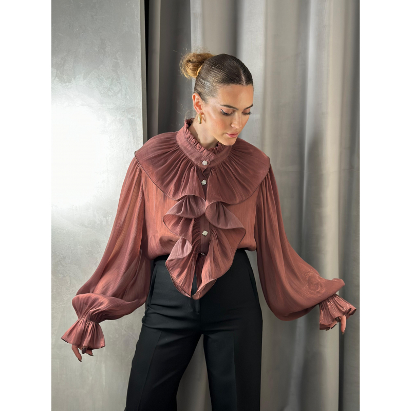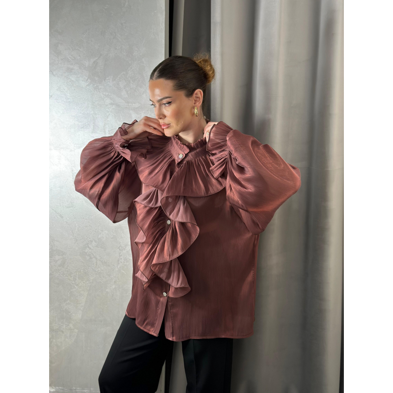 Kemishe me pala valezuese tek jaka dhe menget. Material transparent, shoqerohet me kanotiere per t’u veshur posht.