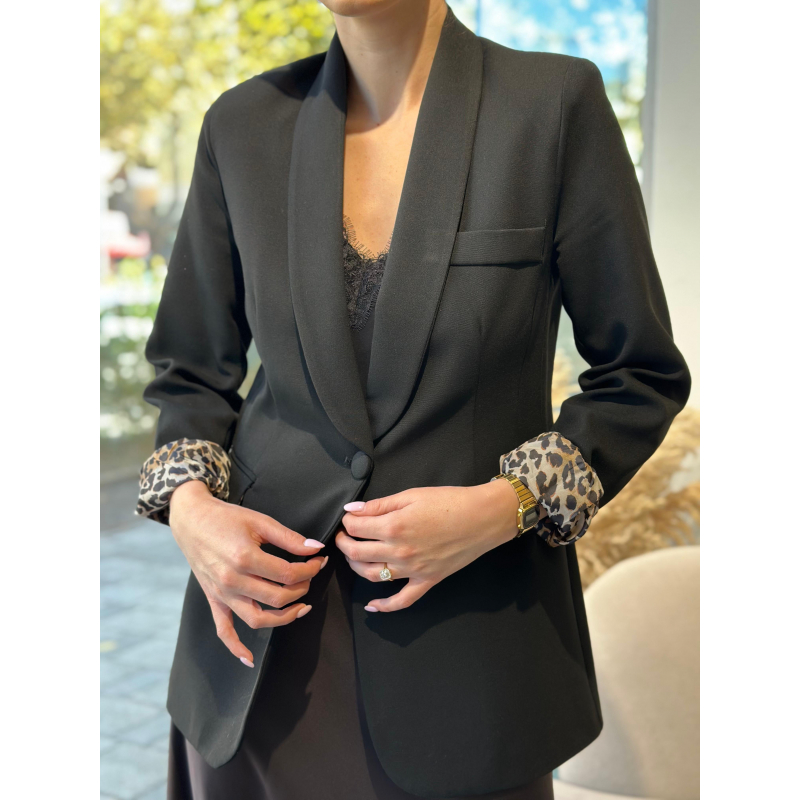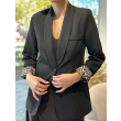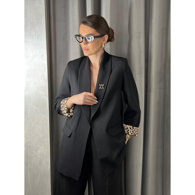 Xhakete e gjate e zeze me prerje fit dhe me nje kopse. Brenda me astar leopard qe bie ne sy kur palosen menget duke i dhene nje prekje moderne xhaketes.
