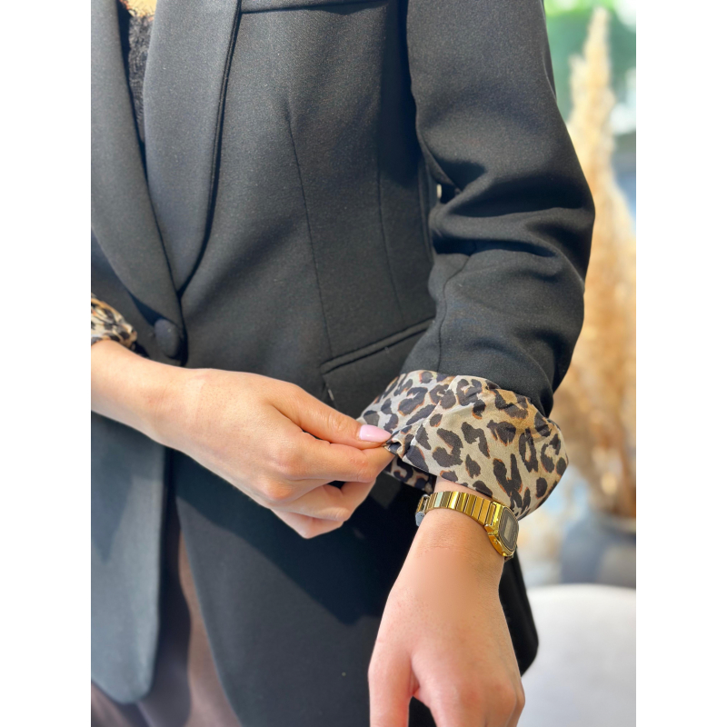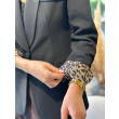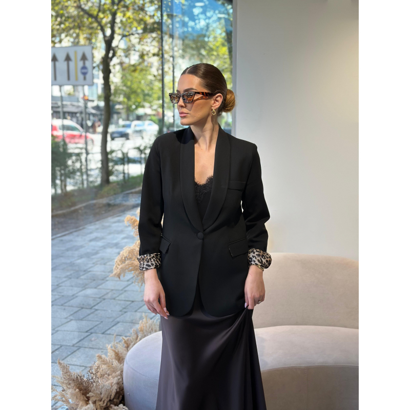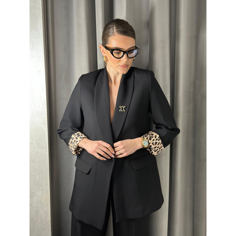 Xhakete e gjate e zeze me prerje fit dhe me nje kopse. Brenda me astar leopard qe bie ne sy kur palosen menget duke i dhene nje prekje moderne xhaketes.